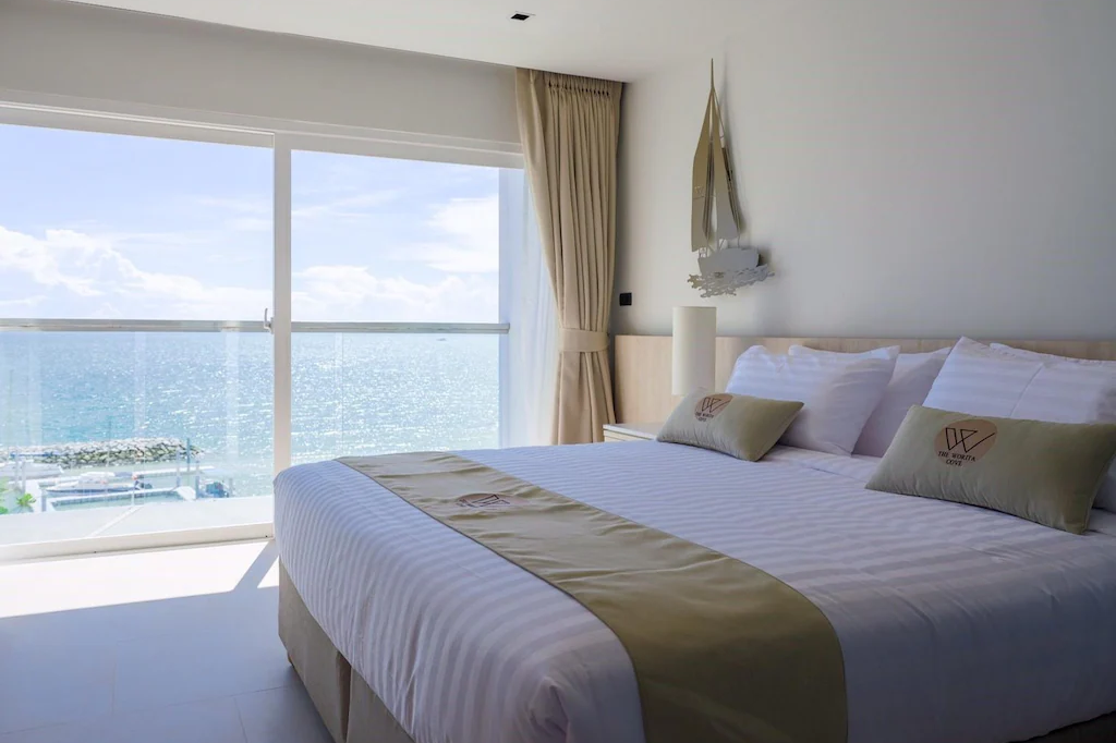 Worita Cove Hotel in Na Jomtien is a peaceful beachfront stay about 30 minutes from Pattaya city. It’s a 5-star, couple-friendly property known for its privacy and nearby seafood spots. Rooms are modern with sea-view balconies, Smart TVs, AC, and comfortable beds.